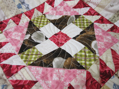Most of the sting triangle blocks are in sets of four, like this. It was hard to get a picture where you could see the quilting, but its there! Then I have to tie and hide all the threads! I don't even want to do the math on that! So I keep telling myself "I'm having fun", and the good news is I believe its true!! So I'll take a nice picture when its hanging at the show to share with you, or you could come and see it in person!!